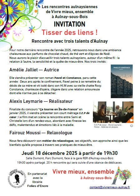 Pour notre dernière rencontre de l’année 2025, retrouvons-nous dans une ambiance chaleureuse aux parfums de chocolat chaud, de thé vert et d’épices de Noël.Nous aurons le plaisir d’accueillir trois talents aulnaysiens, autour d’un même fil : la relation à l’autre, la sensibilité et la quête de mieux-être.