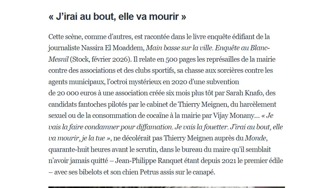 48h avant à sa défaite, Thierry Megnein s'en est pris dans Le Monde à la journaliste Nassira El Mohaddem : "Je vais la faire condamner pour diffamation. Je vais la fouetter. J'irai jusqu'au bout, elle va mourir, je la tue". L'édile LR du Blanc-Mesnil, reproche à la journaliste, qui avait été reçue à Aulnay, la publication de son livre "Main basse sur la ville. Enquête au Blanc-Mesnil" dans laquelle elle dénonce un système Megnein (elle parle d'affairisme, clientélisme, menaces, manipulations, harcèlement...)