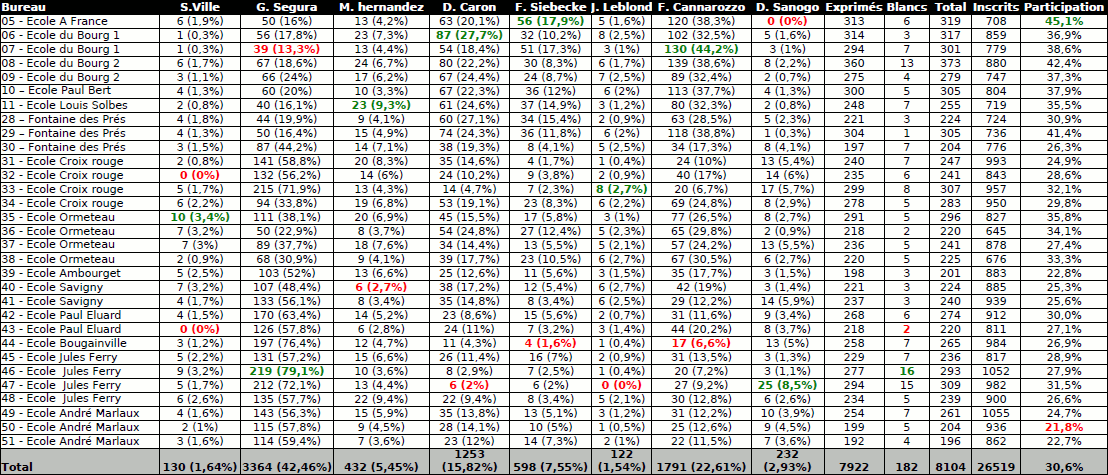 Voici les résultats détaillés, bureaux par bureau. Les résultats globaux ont été présentés dans l'article précédent.