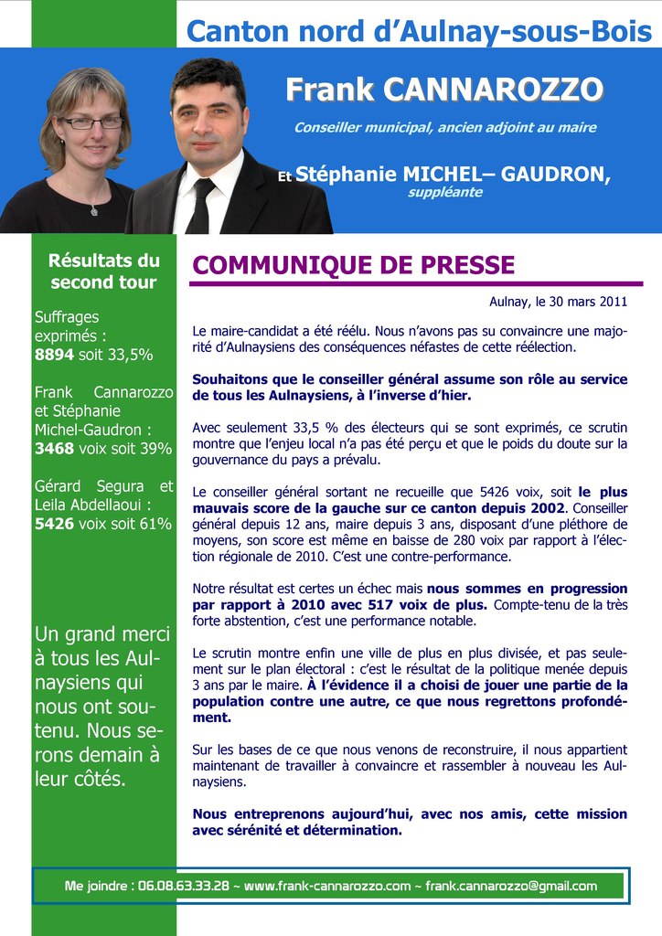 Frank Cannarozzo, candidat aux élections cantonales (Aulnay Nord), battu au second tour (un peu moins de 39% des voix contre un peu plus de 61% pour son adversaire, le candidat sortant et maire Gérard Ségura), nous adresse un communiqué.