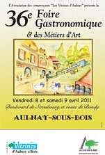 L'association des commerçants "Les Vitrines d'Aulnay" annonce l'organisation de la   36ème Foire Gastronomique, du vendredi 8 au samedi 9 avril 2011.