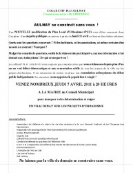 Le collectif PLU, formé d'une dizaine d'associations, nous adresse un tract dans lequel il exprime son mécontentement suite à l'annonce du projet de modification du PLU dans le dernier numéro de l'hebdomadaire municipal Oxygène. La principale cause, cette fois-ci, est le début de l'enquête publique, prévue le 11 avril 2011. Selon ce collectif, ni les associations, ni les riverains concernés, ni certains élus n'auraient été avertis de ce projet.
