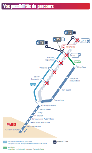 À partir de Roissypôle la navette CDGVAL dessert ensuite les terminaux 1 et 2. Toutes les infos sont sur le document édité pour l'occasion, que vous pouvez télécharger ici, ou sur le site Transilien.