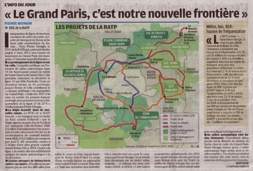 Pierre Mongin a présenté les projets de la RATP, dont il est PDG, pour l'année 2012. La carte publiée dans l'édition du Parisien datée du 17 janvier 2012 fait état d'incertitudes sur plusieurs lignes du Grand-Paris Express, dont la ligne Le Bourget-Noisy Champs qui devrait desservir Aulnay-sous-Bois, près du carrefour de l'Europe.