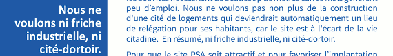 Examinez le retournement: Pendant la campagne de 2014, ce qui deviendra l'équipe municipale actuelle ne tarissait pas de critiques pour dénoncer "le bétonnage" et les supposés "projets cachés" de la municipalité sortante pour construire des immeubles. Sur le site de PSA, M. Beschizza était plus précis. Ainsi dans un tract intitulé "Notre projet pour PSA", le candidat choisissait des mots durs et précis pour indiquer très clairement son opposition à toute construction de logements sur le site de PSA "qui deviendraient automatiquement un lieu de relégation pour ses habitants car le site est à l'écart de la vie citadine". Il n'hésitait pas à qualifier l'idée d'un tel projet de "cité dortoir".