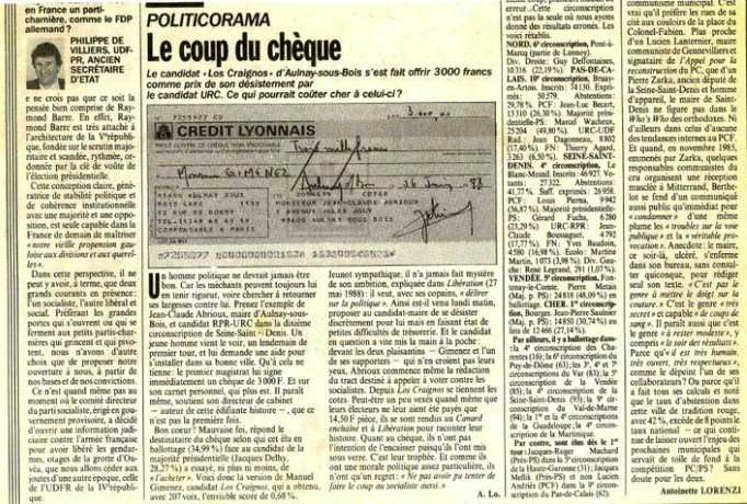 Jean-Claude Abrioux n'hésita pas à monnayer ces quelques voix contre un chèque qui fit la une du Canard enchaîné. On n'achète pas cette idéologie... Le chèque n'a jamais été touché, bien entendu...