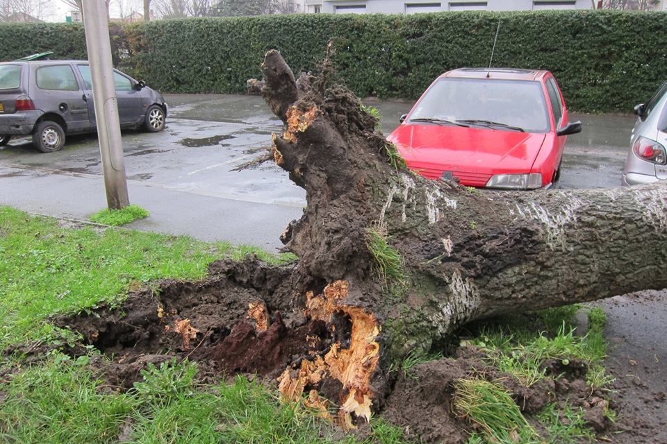 Un arbre, dans le quartier des Mille-Mille, rue des érables s'est couché sur trois voitures suite à un petit orage de grêle. Il semble que cet arbre n'était pas en parfait état vu ses racines.