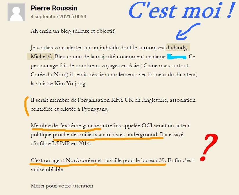 Je ne sais pas si ce blog est sérieux d’après ce troll Pierre Roussin, j’en doute, mais celui qui publie ça est nul et dans la diffamation. J’ai demandé à plusieurs reprises qu’on vire ce com’, je suis même allé en « haut lieu », mais voilà cette m*** est toujours présente… ***