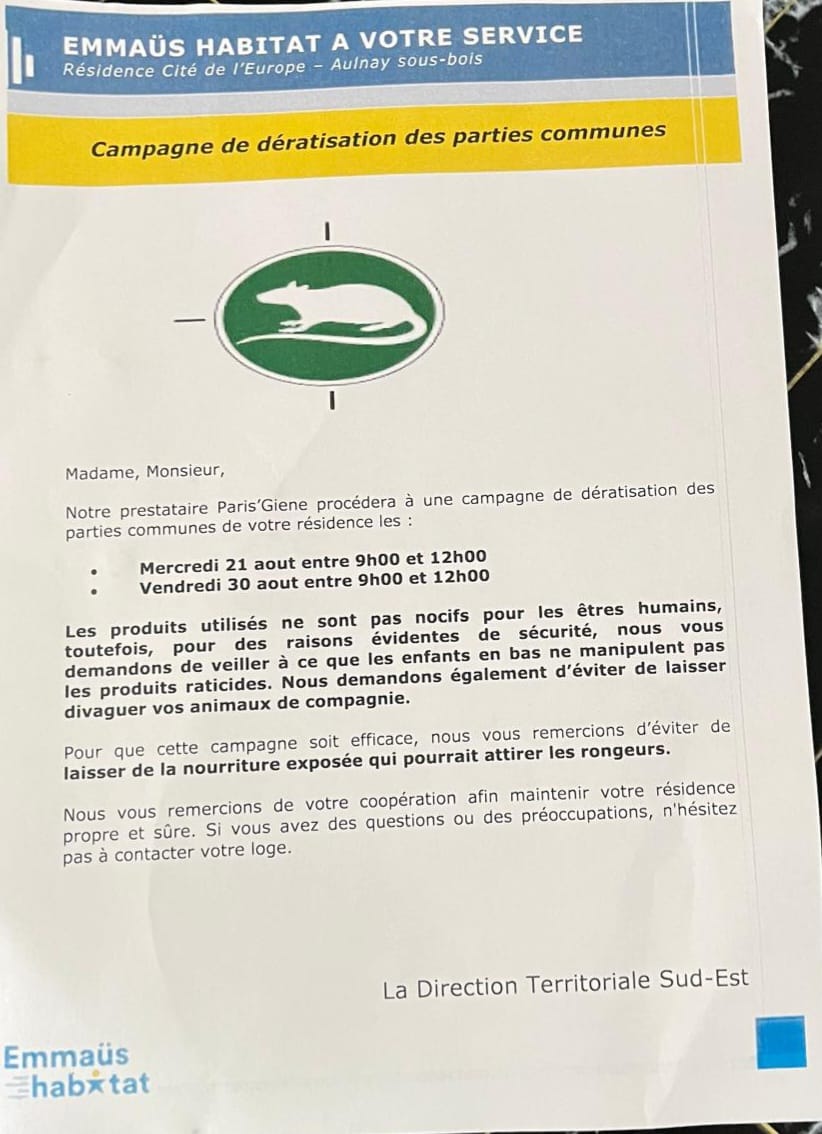 Quoi qu'il en soit, le bailleur Emmaüs Habitat a annoncé aux locataires la programmation d'une campagne de dératisation des parties communes et des extérieurs ainsi que le traitement des terriers le mercredi 21 et 30 août.