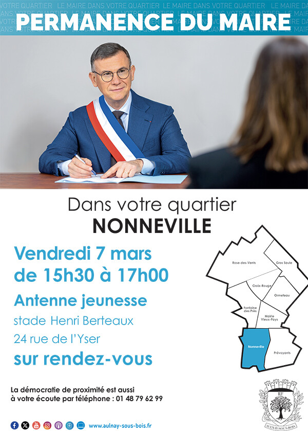 Quartier par quartier, notre maire propose de nous rencontrer sur rendez-vous. Sur les réseaux sociaux, certains aulnaysiens regrettent l’horaire peu compatible avec une vie professionnelle, mais il ne change pas ses horaires ...