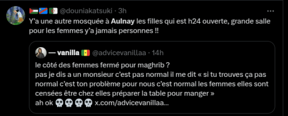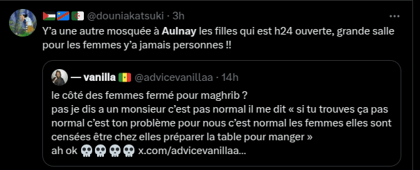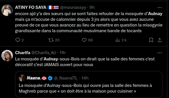 Certaines femmes se disent refoulées de la mosquée. Les raisons sont diverses. On leur aurait dit "qu'elles doivent être à la maison pour cuisiner", ou que la salle des femmes n'était pas ouverte !
