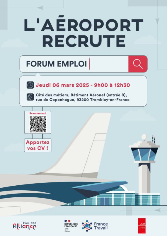 Ne manquez pas le forum l’Aéroport recrute organisé par la cité des métiers le jeudi 6 mars de 9h à 12h30 à la Cité des métiers Charles de Gaulle-Alliance !