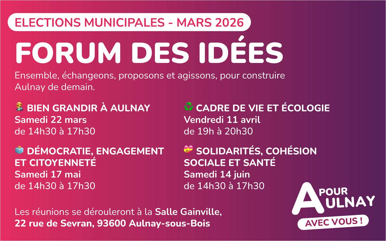 Dans le cadre des élections municipales , qui se tiendront dans un an, nous organisons un forum des idées pour construire un projet municipal AVEC et POUR les Aulnaysiennes et les Aulnaysiens.
