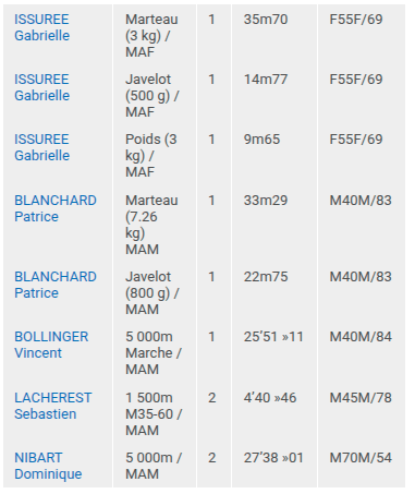 Gabrielle Issurée en F55 s'est offert un excellent triplé en lancers. Toujours en lancers Patrice Blanchard en M40 réalise un beau doublé.