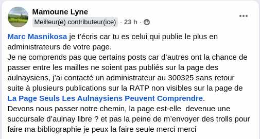 Alors que sur les réseaux sociaux, notre blog est attaqué par un élu nous traitant de menteurs, de "spécialistes de la désinformation", aucune réponse de Marc Masnikoza qui détient maintenant la page FB #Seulsles aulnaysienspeuventcomprendre" après notre article. Mais de nombreux commentaires se désolent de ce qu'est devenue cette page :
