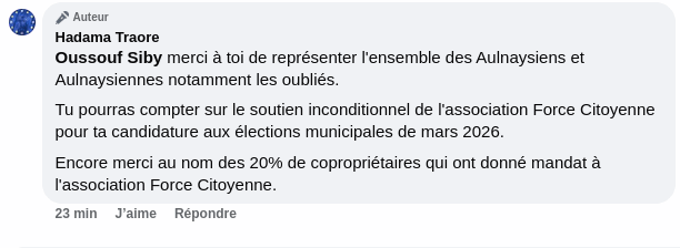 Suite à la dernière interpellation de Oussouf Siby sur la situation dans la résidence de la Morée, dans un commentaire sur sa page Facebook, Hadama Traoré semble soutenir Oussouf Siby aux prochaines élections municipales: