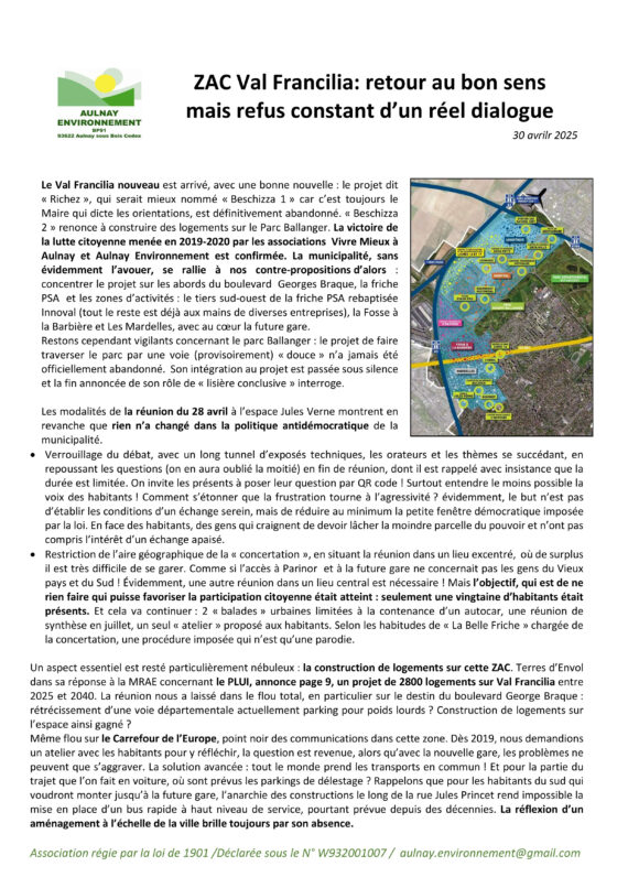 5 Réponses à “ZAC Francilia, « retour au bon sens mais refus constant d’un réel dialogue » d’après Aulnay Environnement”