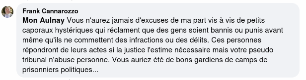 Nous aurions aimé que sa réponse ressemble plutôt à celle de la première adjointe, Séverine Maroun, qui a répondu dans un commentaire FaceBook en toute simplicité : "MonAulnay vous le savez c’est indépendant de notre volonté. On aura jamais accepté ces gens en toute conscience. Je reconnais être une quiche en politique internationale et européenne, je ne connais pas les noms des fous. Je ne peux être que d’accord avec vous, ils sont à