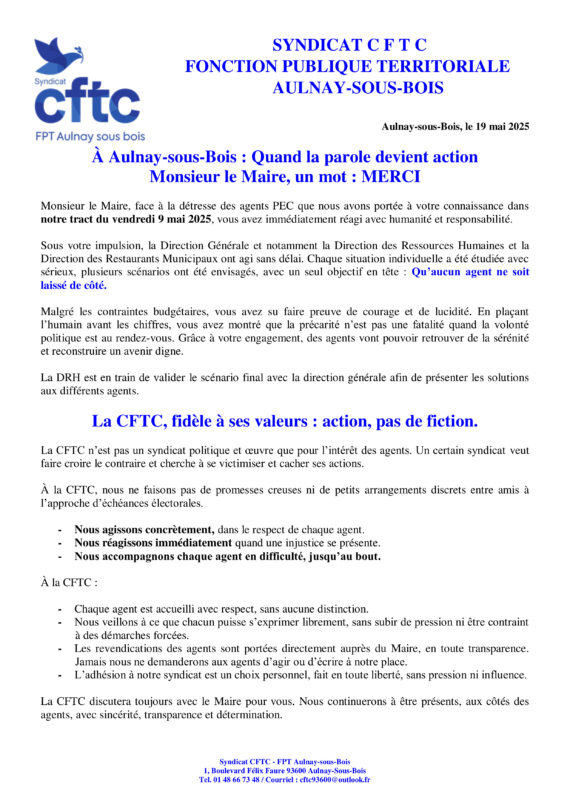 Suite au tract de la CFTC que nous avions publié, la réponse du maire réjouit la CFTC.