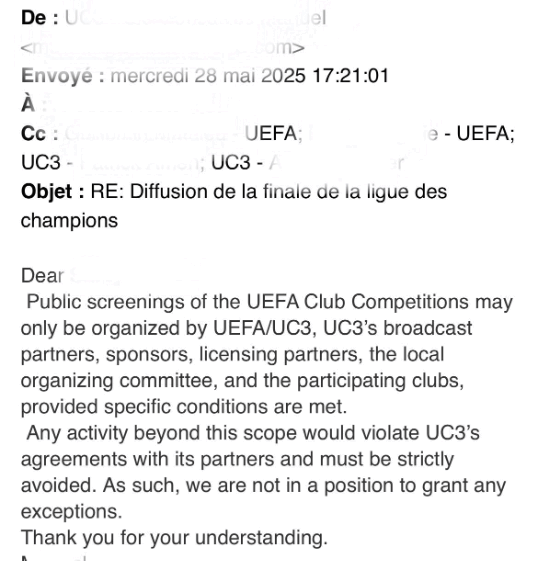 Malheureusement, l’UEFA n’autorisera finalement pas la diffusion publique de ce match en raison de droits de diffusion strictement encadrés.