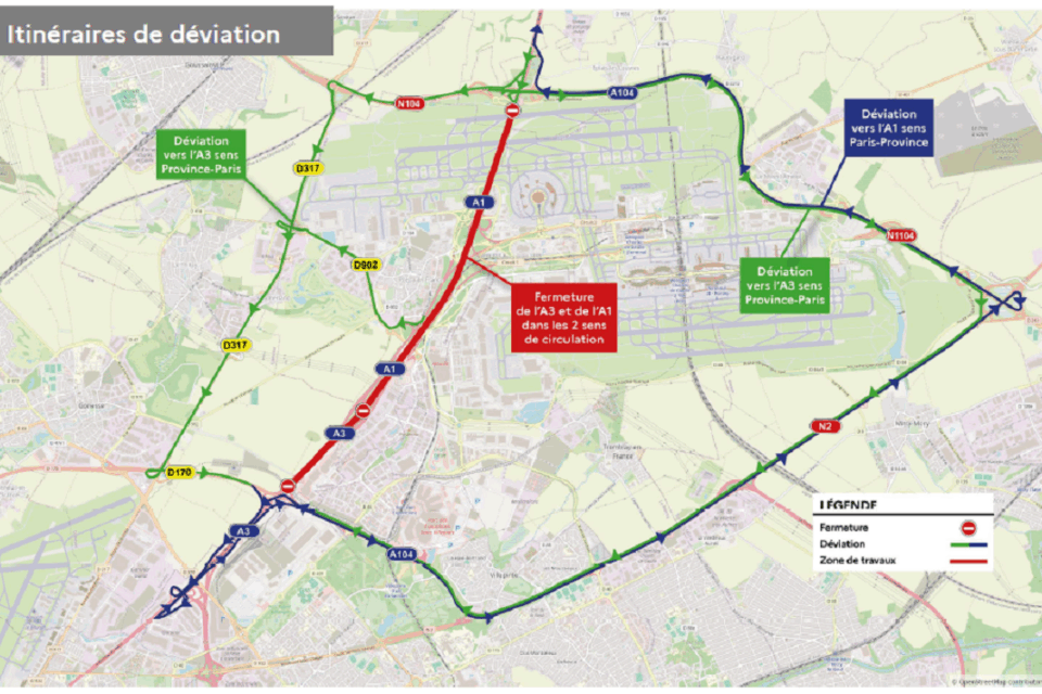 Ainsi, le tronçon entre Aulnay-sous-Bois et Chennevières-lès-Louvres, situé sur l’A1, sera fermé dans les deux sens du mercredi 14 au jeudi 15 mai, du jeudi 15 au vendredi 16 mai, et du lundi 19 au vendredi 23 mai de 22 heures à 4h30. Aux mêmes dates et aux mêmes heures, sera interdit l’accès à l’A3 entre Aulnay-sous-Bois et l’aéroport Paris Charles-de-Gaulle. La DiRIF indique que d’autres fermetures, du 5 au 6 juin et du 10 au 13 juin, pourraient être ordonnées si les travaux n’étaient pas achevés.
