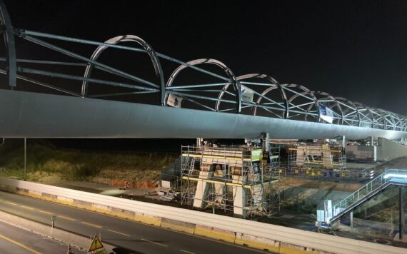 Une opération délicate. Il s’agit de faire glisser cette structure en acier de 20 000 tonnes (deux fois le poids de la tour Eiffel !) sur les piles en béton, hautes de six mètres, déjà installées au-dessus des voies de l’autoroute. Il y en a 14 au total à franchir. Cet ouvrage fait partie du tronçon aérien, qui reste à construire, menant de la gare souterraine du Triangle de Gonesse, dont l’ouverture est prévue en 2028, jusqu’aux abords de Roissy, en passant par le parc des expositions.