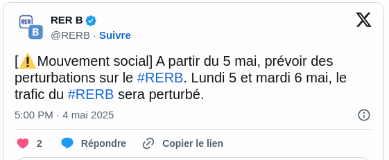 Des perturbations sont à prévoir notamment sur les lignes B (un train sur deux au nord et deux trains sur trois au sud de la ligne le lundi 5 mai et le mardi 6 mai)
