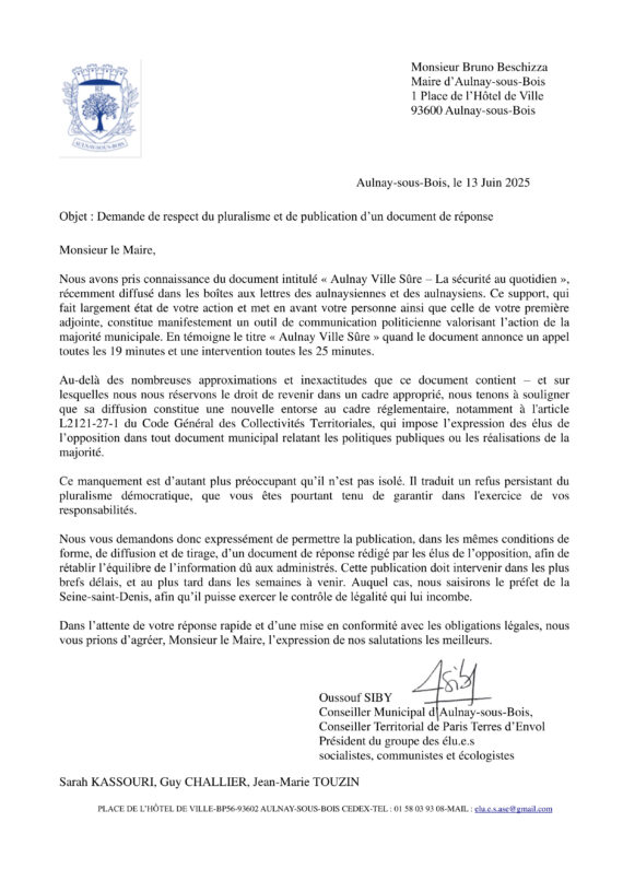 Vous l'avez peut-être reçu, ce prospectus distribué dans nos boites aux lettres vante la sécurité dans notre ville, une analyse municipale. D'après Oussouf Siby, le droit oblige dans un tel manuscrit de donner la parole à l'opposition. Ci-dessous, la lettre envoyée au maire :