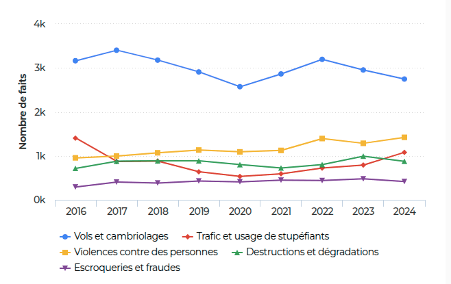Ce tableau montre certes une baisse importante des vols et cambriolage, une légère baisse des destructions et des dégradations, mais montre aussi une hausse du trafic de stupéfiants et des violences contre les personnes .