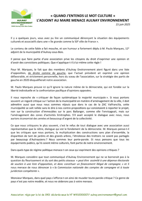 Une Réponse à “L’adjoint au maire menace Aulnay Environnement”