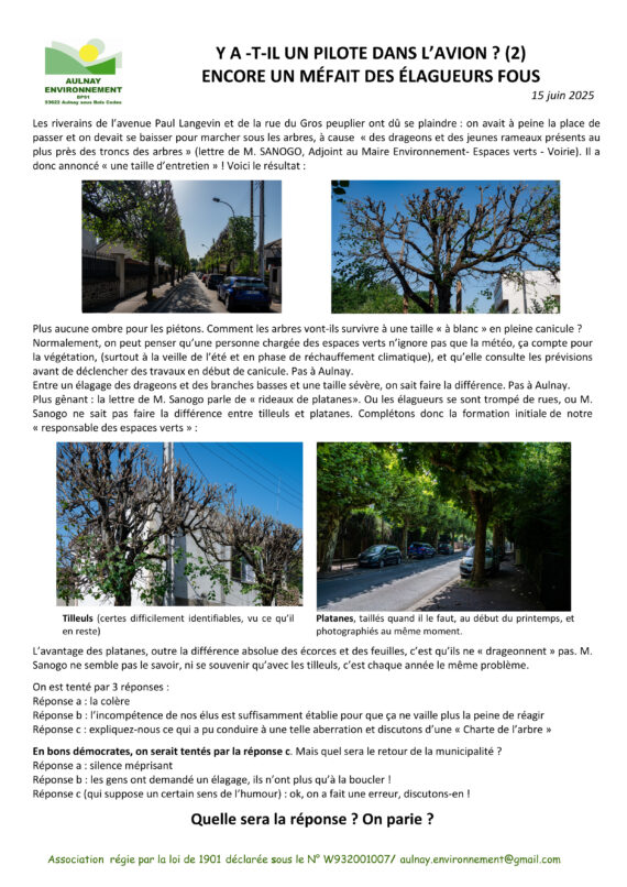 7 Réponses à “L’élu chargé des espaces verts semble confondre tilleul et platane, « Y a-t-il un pilote dans l’avion(2) » ? par Aulnay environnement”