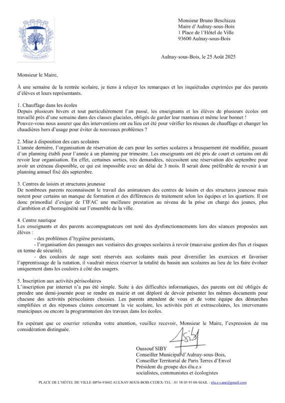 Dans le courrier ci-dessous, Oussouf Siby, Président du groupe d'opposition PCF-PS-EELV s'adresse au maire: