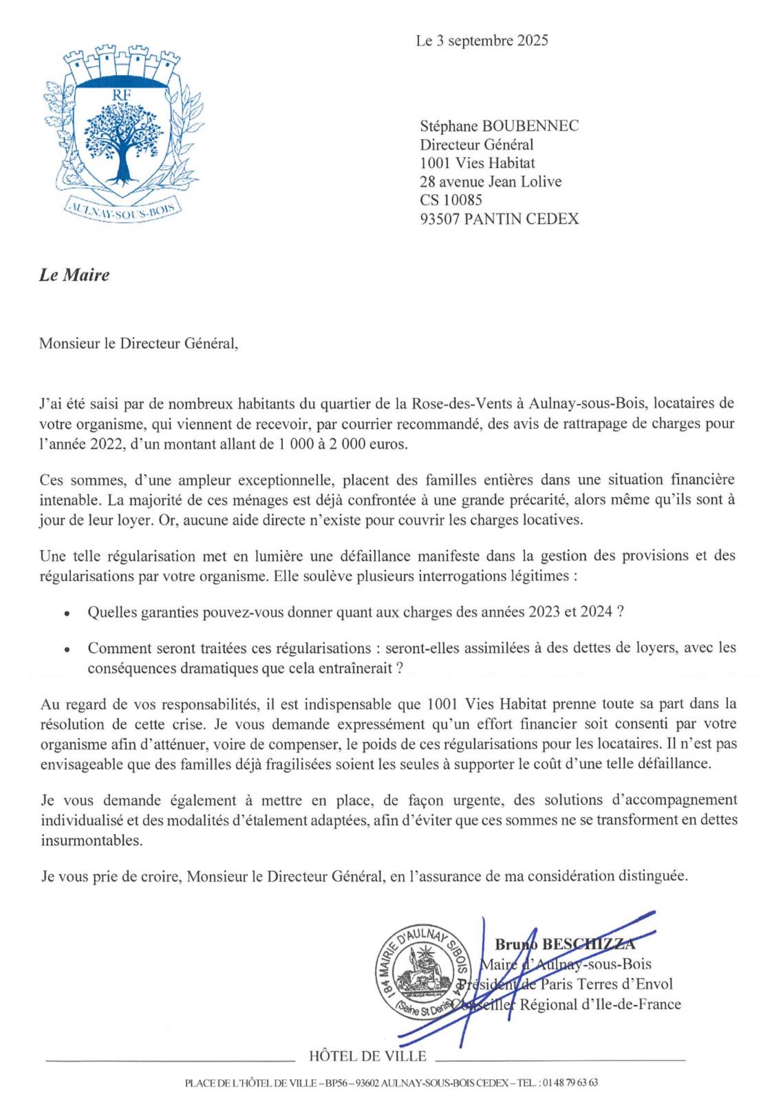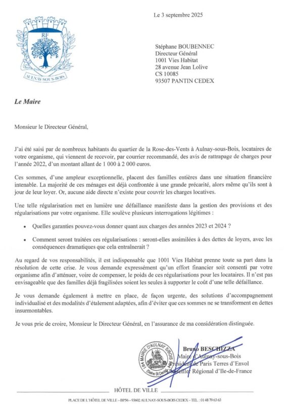 Face à cette situation, un courrier officiel a été adressé au Directeur Général de 1001 Vies Habitats par Bruno Beschizza