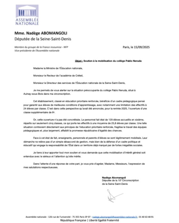 Nous, parents d’élèves, enseignants, personnels éducatifs, habitants du quartier, et soutiens de la communauté éducative du collège Pablo Neruda, demandons l’ouverture urgente d’une classe supplémentaire de 6e pour la rentrée scolaire 2025-2026, au sein de notre établissement classé REP+.