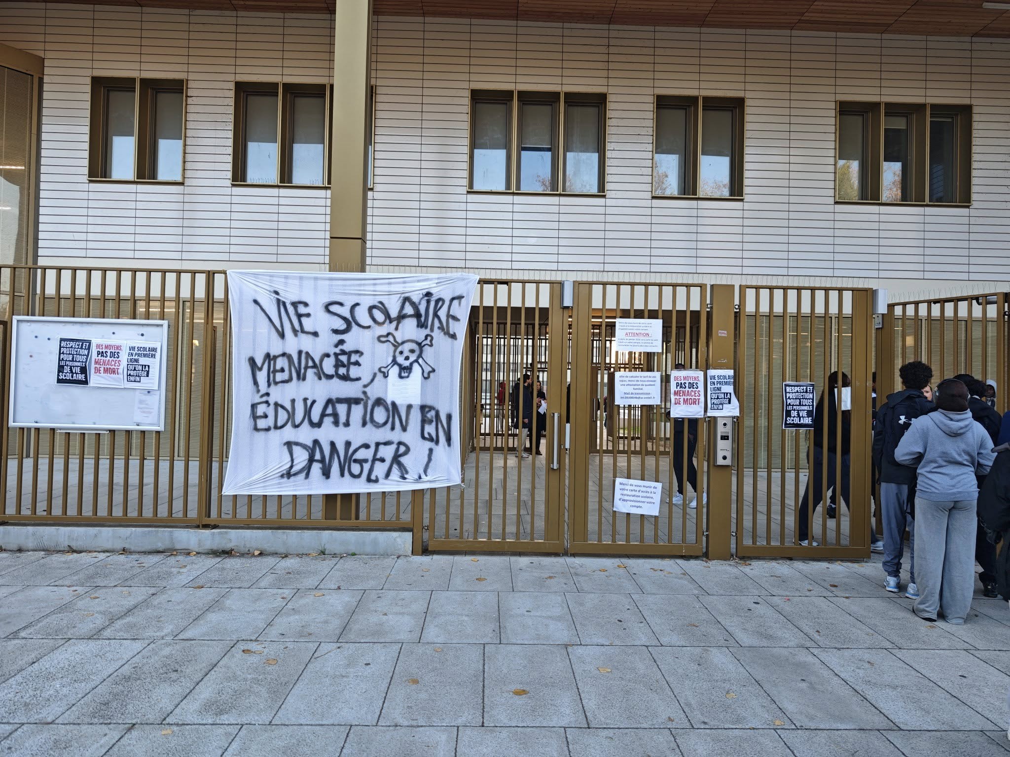 "Depuis ce matin, l’ouverture des grilles a eu lieu à 7h40, assurée par la direction, alors qu’une soixante d’enseignant.e.s se sont déclaré.es grévistes en soutien à leurs collègues de la vie scolaire. Durant la journée, en l’absence complète de vie scolaire, plusieurs incidents graves ont été répertoriés :