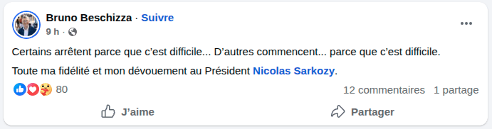 Dans un post sur sa page Facebook, notre maire nous rappelle sa relation étroite avec Nicolas Sarkozy, à l'heure de son incarcération à la prison de la Santé.
