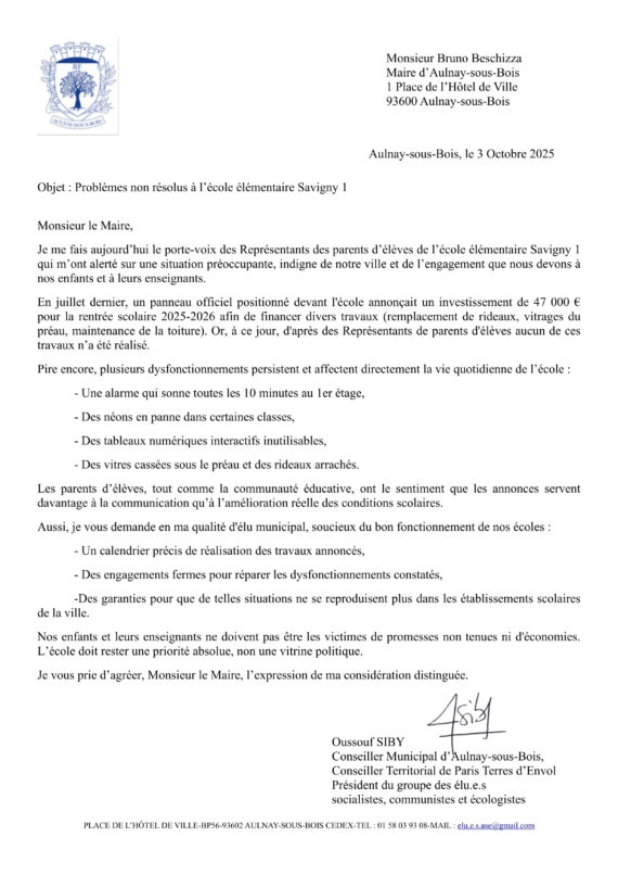 Une Réponse à “École Savigny 1, promesses non tenues et dysfonctionnements, Oussouf Siby écrit au maire”