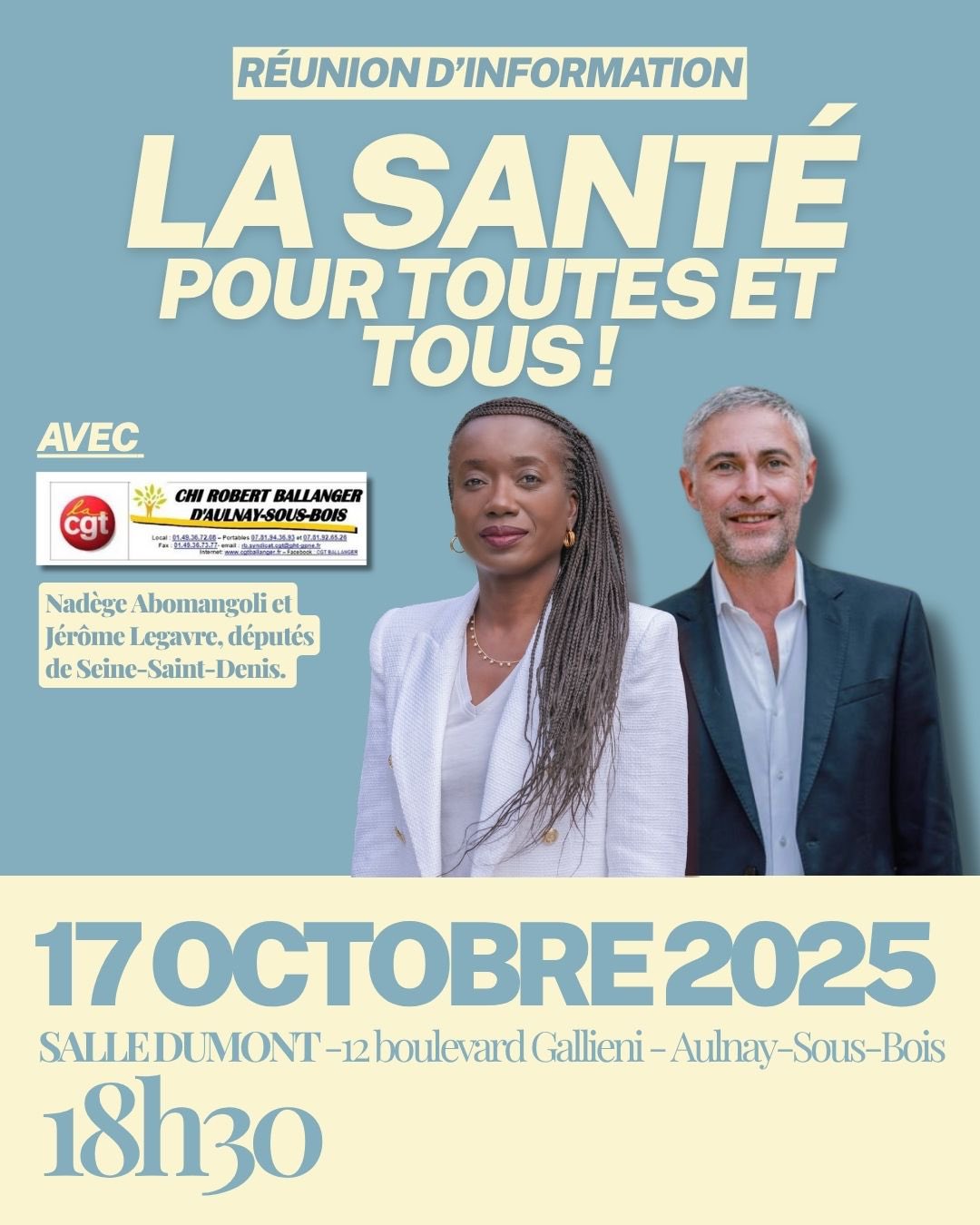 Ce vendredi 17 octobre, avec mon collègue LegavreJerome , nous vous invitons à venir débattre avec la CGT Ballanger, au sujet du projet de fusion des hôpitaux d’Aulnay, Montfermeil et Montreuil.
