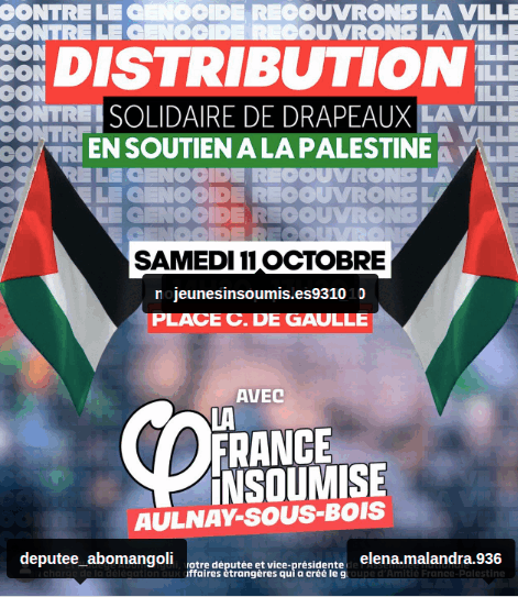 Ce samedi, rendez-vous à 15 h 00 pour une distribution solidaire de drapeaux palestiniens contre le génocide et la colonisation ! Nous serons jusqu’à 17 h 00 sur la place Charles de Gaulle à la gare d’Aulnay-sous-Bois.