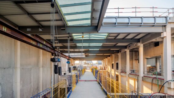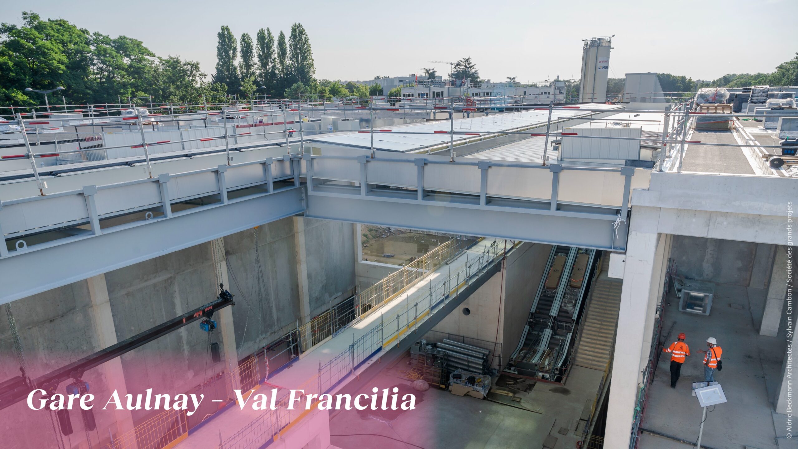Après plusieurs années de travaux en souterrain, les gares de la ligne 16 sortent peu à peu de terre et laissent apercevoir leurs volumes. Sur les communes d’Aulnay-sous-Bois et du Blanc-Mesnil, les bâtiments voyageurs émergent derrière les palissades de chantier avec la réalisation des charpentes métalliques de deux futures gares.