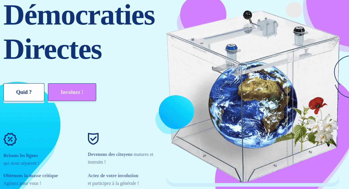 Sur son site, "Démocraties directes " se définit ainsi : "Démocraties Directes n'est pas un parti, pas un mouvement, pas un collectif, pas un groupe de réflexions, pas une association, et ne sera jamais rien de tout cela.(...) Nous avons pour mission de rassembler, de fédérer, d'informer et d'acter pour une citoyenneté enfin mature, qu'elle soit anonymisée ou à visage découvert."