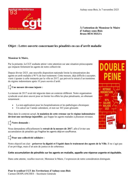 La CGT des territoriaux d'Aulnay-sous-Bois s'adresse au Maire pour revendiquer la suppression de la mesure locale de ponction du régime indemnitaire en cas de maladie. Avec la mesure nationale de 10 % de salaire en moins par jour d'arrêt maladie, on dit STOP à la DOUBLE PEINE.
