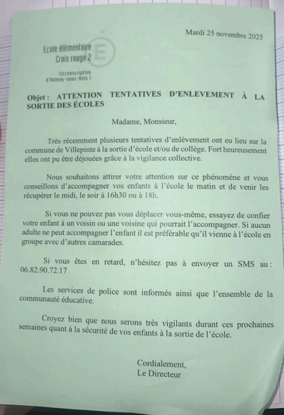 Il est fort probable qu'il ait eu l'autorisation de l'académie de Créteil pour l'envoyer. Sans tomber dans la psychose, si services de police et Éducation Nationale interviennent, soyons vigilants.