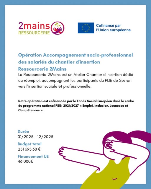 De janvier à décembre 2025, ce soutien nous permet de poursuivre notre engagement en faveur du réemploi, de l’inclusion sociale et de l’accès à l’emploi pour les participants du PLIE [ NDLR : Plan Local pour l'Insertion et l'Emploi] de Sevran.
