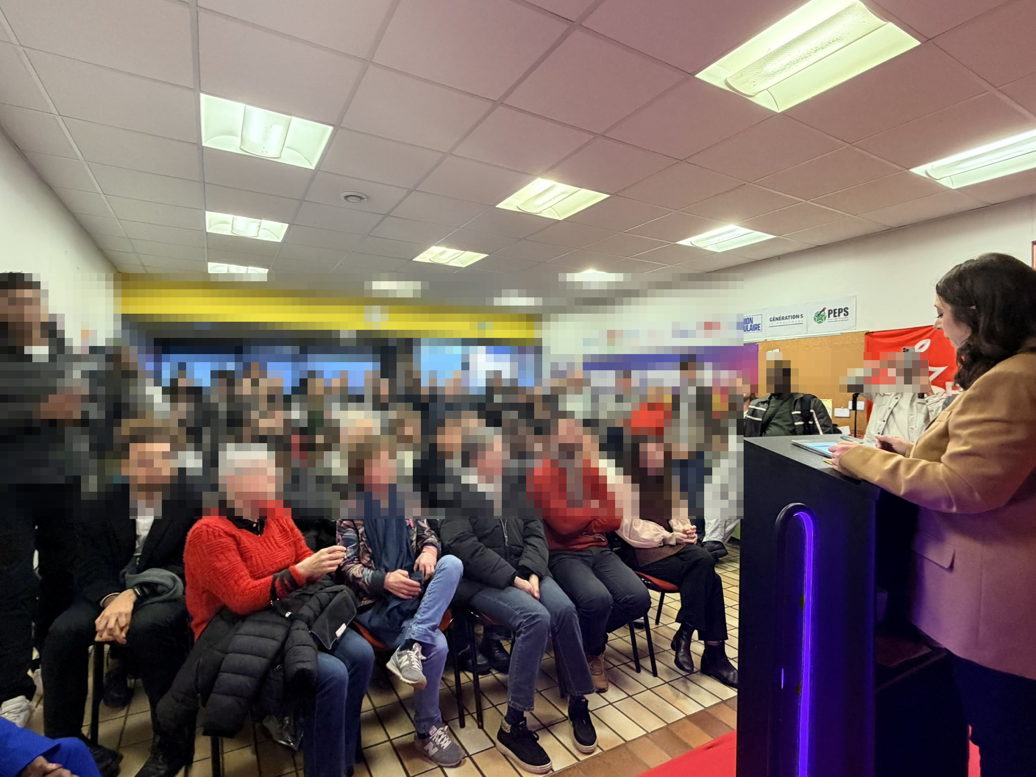 MAJ le 25/12: Un des organisateurs nous avait interdit de prendre le visage des participants. Sur X, un des intervenants a fait autrement. Nous publions sa photo que nous avons floutée afin que vous puissiez voir que la salle était comble :