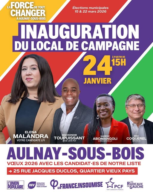 Avec Mackendie Toupuissant, nous aurons l’honneur d’avoir avec nous notre députée, première vice-présidente de l’Assemblée nationale, Nadège Abomangoli. Éric Coquerel, président de la commission des finances sera également parmi nous."
