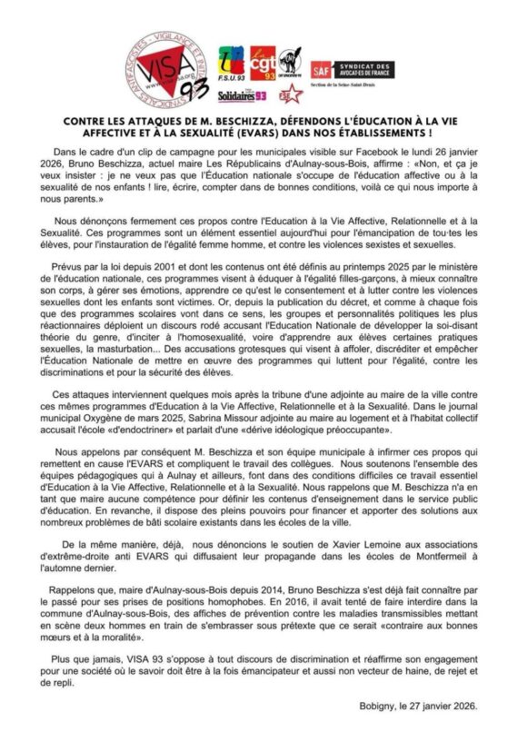27 janvier 2026 :La FSU 93 condamne les propos de Bruno Beschizza sur l’école