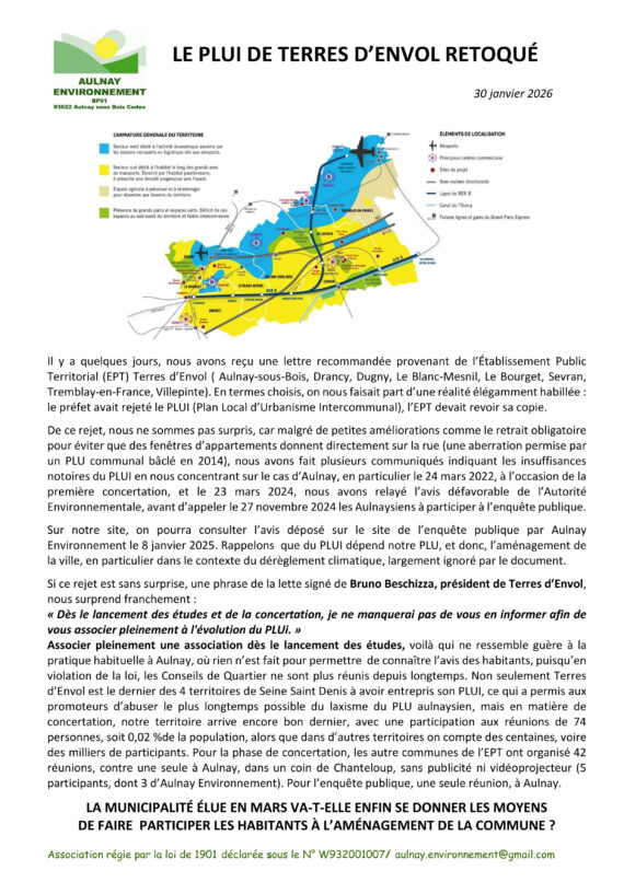 2 février 2026 :Le PLUi rejeté par la préfecture !C'est ce qu'annonce l'association "Aulnay Environnement" dans le communiqué ci-dessous :
