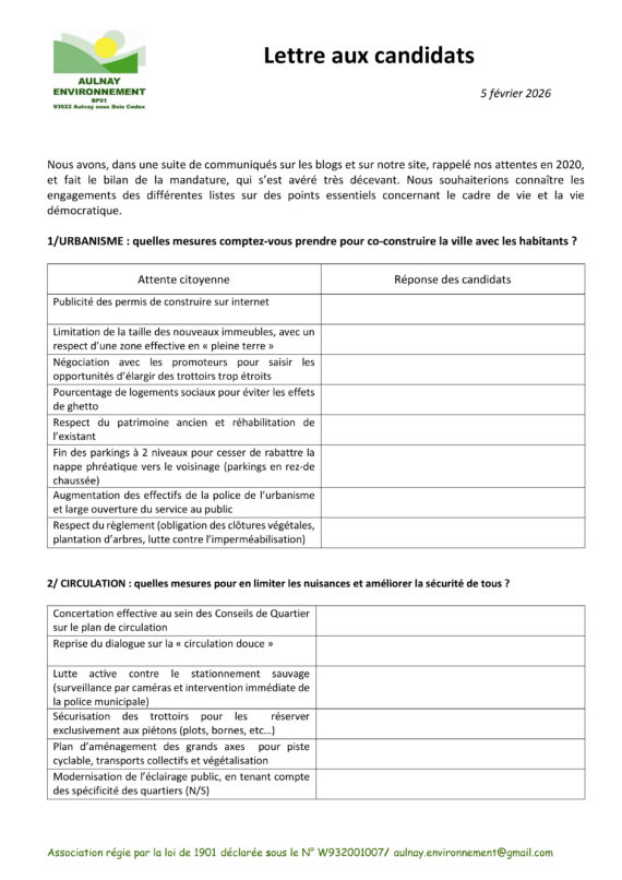 10 février 2026 :Les attentes d’Aulnay Environnement : Lettre aux candidats