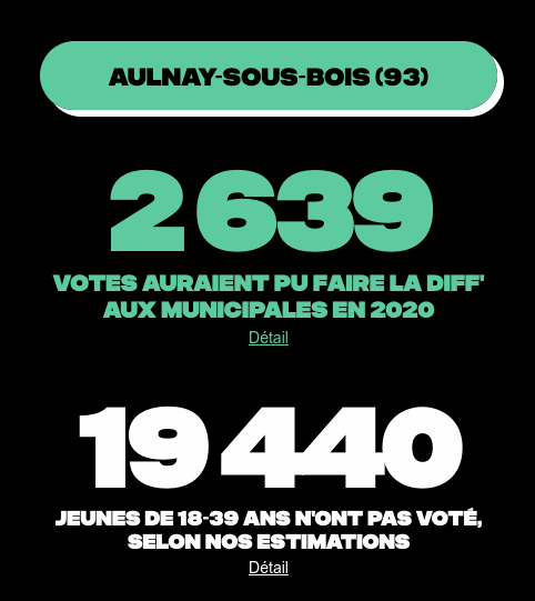 Selon le site mobilisator.fr, qui appelle les 18-39 ans à se rendre aux urnes, cette tranche d’âge est celle qui s’abstient le plus. À Aulnay, leur poids électoral est loin d’être négligeable : le site affirme que 13,5 % des jeunes auraient pu faire basculer le scrutin en 2020, simplement en votant.